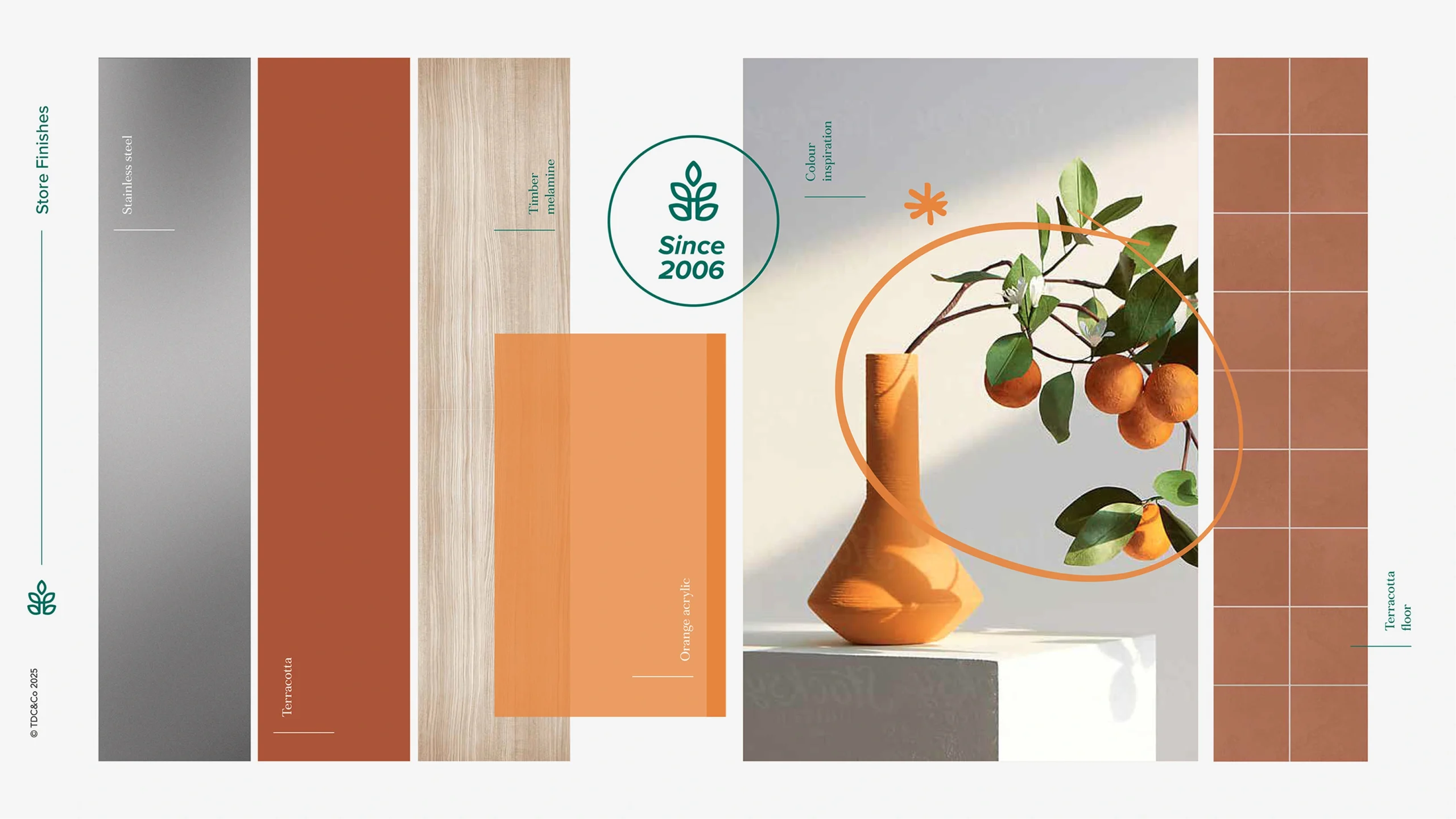 Earthy, natural textures sit alongside more refined, lab inspired elements striking a contrast that creates a subtle, playful tension throughout the space.
